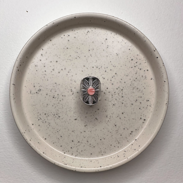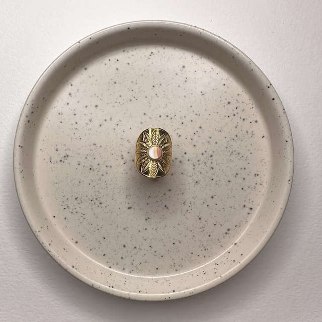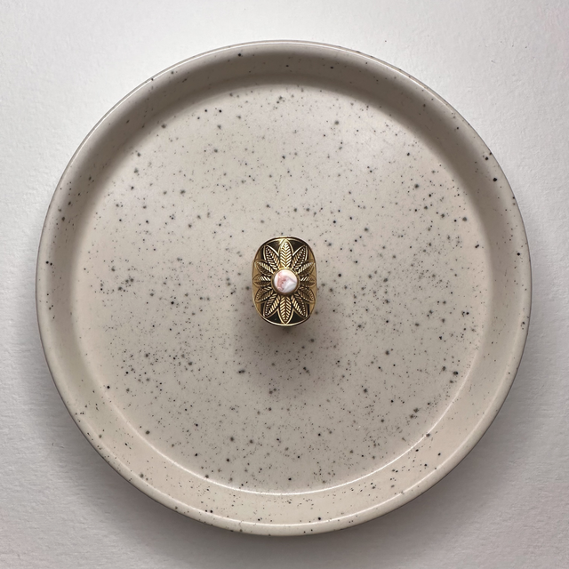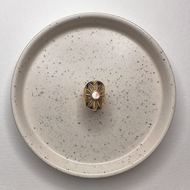 Cabochon unique en conque de lambi, entièrement fait à la main dans mon atelier à Saint-François en Guadeloupe.