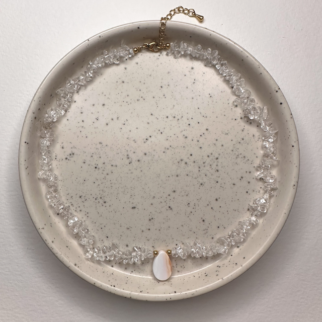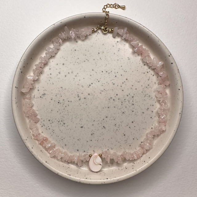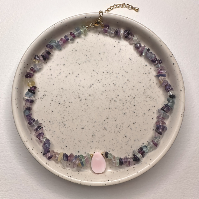Pierres fines (fluorite, quartz et quartz rose) et acier inoxydable 316L.