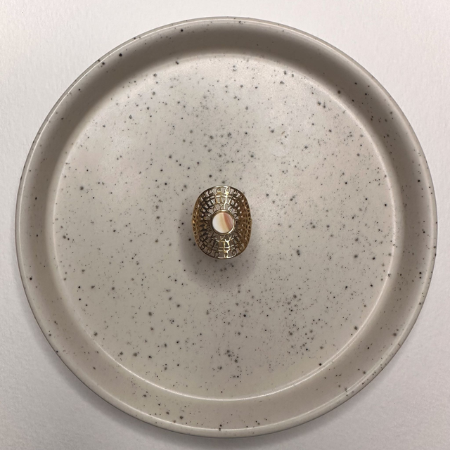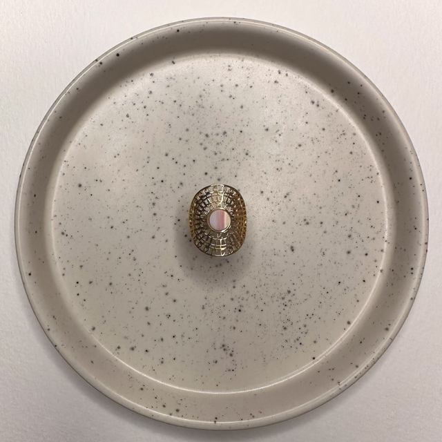 Cabochon unique en conque de lambi, entièrement fait à la main dans mon atelier à Saint-François en Guadeloupe.